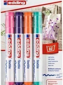Estuche con 4 marcadores para tela Edding 4500. Punta redonda 2-3mm. Colores surtidos divertidos